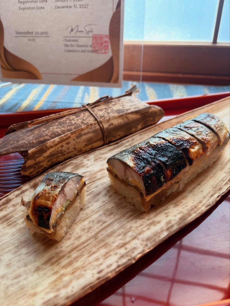 伊東港で水揚げされた鯖を橙酢で〆、具材には卵焼き、酢レンコン、甘く炊いた椎茸、伊豆産のわさびを使い辛味のアクセントを効かせた一品になります。