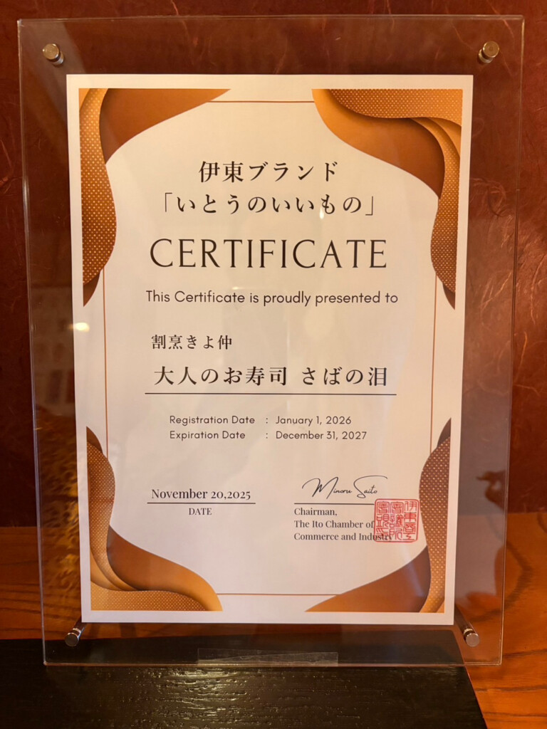 この度、伊東ブランド「いとうのいいもの」に当店 【大人のお寿司 さばの泪】が認定を受けました。